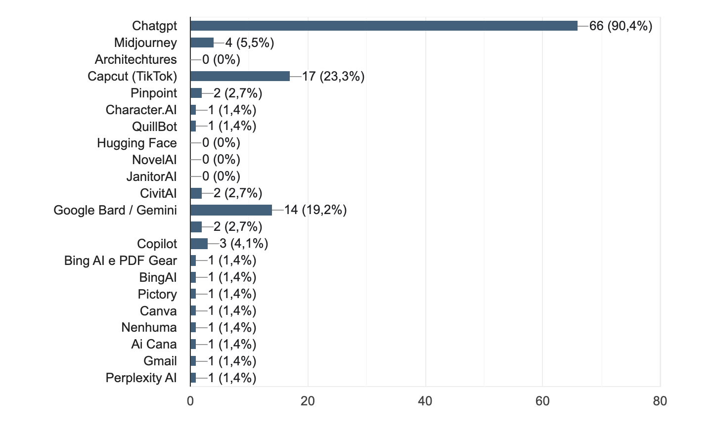 O ChatGPT foi lançado em dezembro de 2022 e tornou-se a aplicação com o crescimento mais rápido da história da internet. Segundo um inquérito realizado, o ChatGPT, é a ferramenta de Inteligência Artificial mais utilizada, correspondendo a 90,4%.
